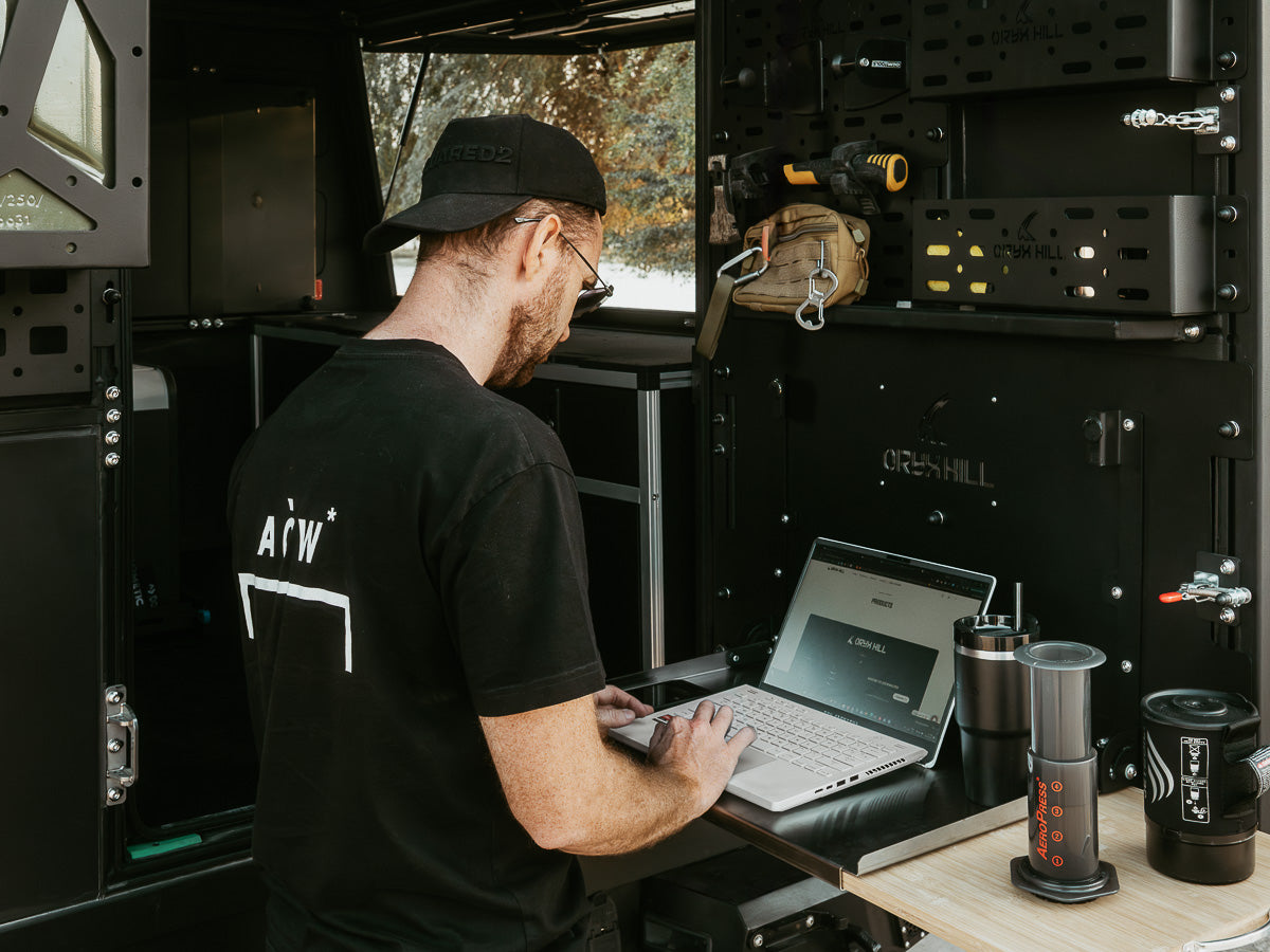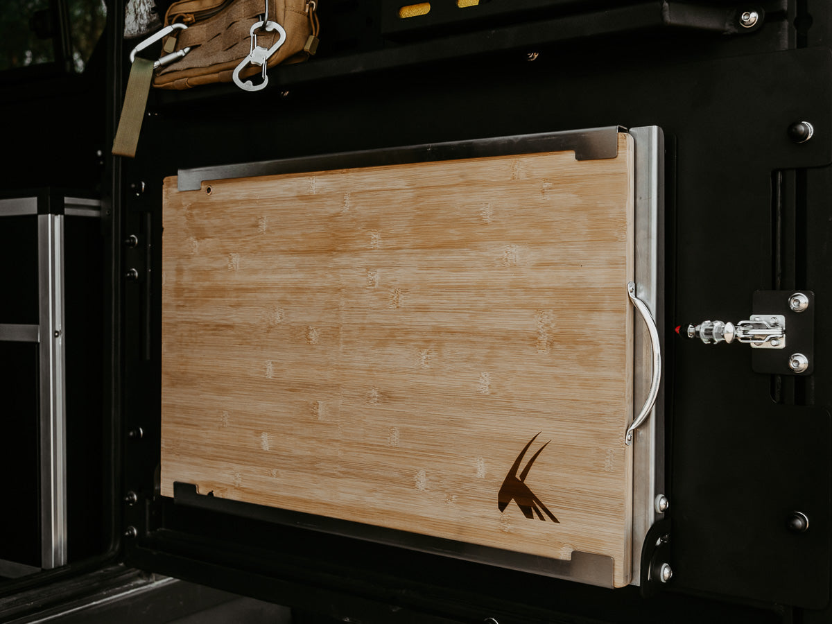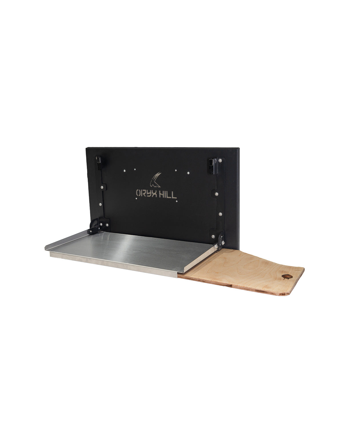 The OryxHill dropdown table for the Alucab Modcap Camper is designed with a sleek minimal designed whilst maintaining a heavy duty table surface.